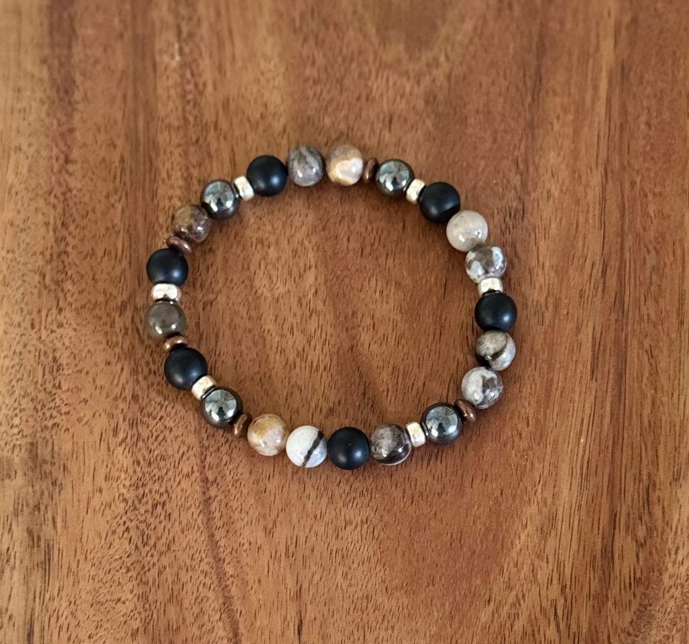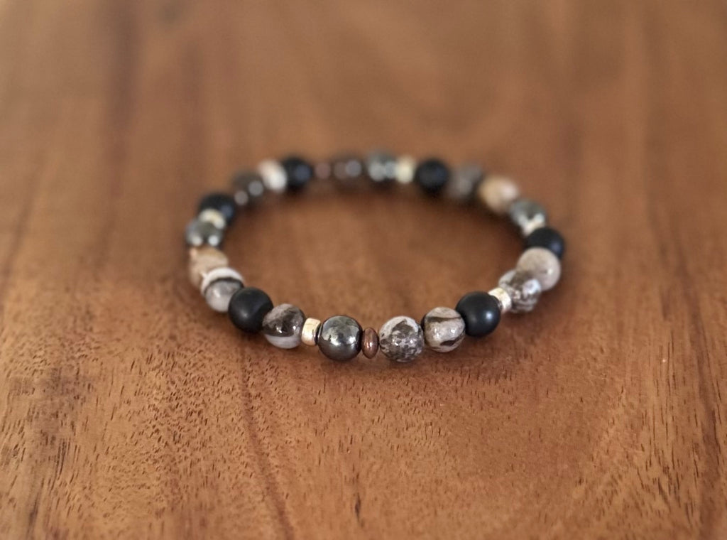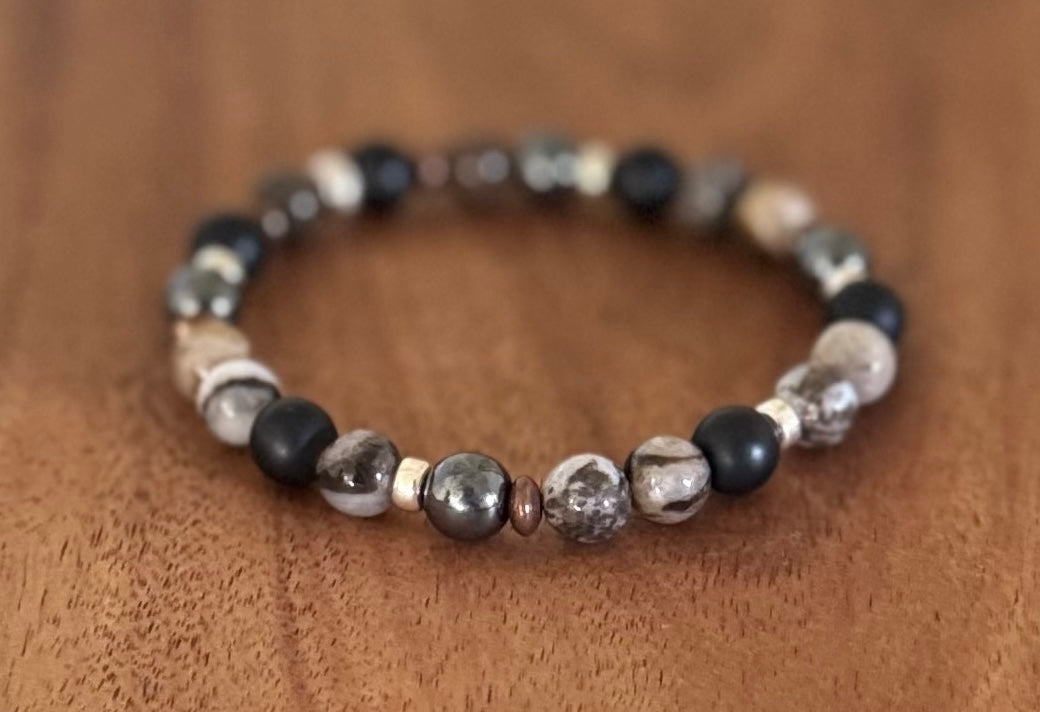 Bracelet élastique en pierres naturelles: Jaspe de bois pétrifié et Hématite, accompagnées de pièces d'argent sterling 925.